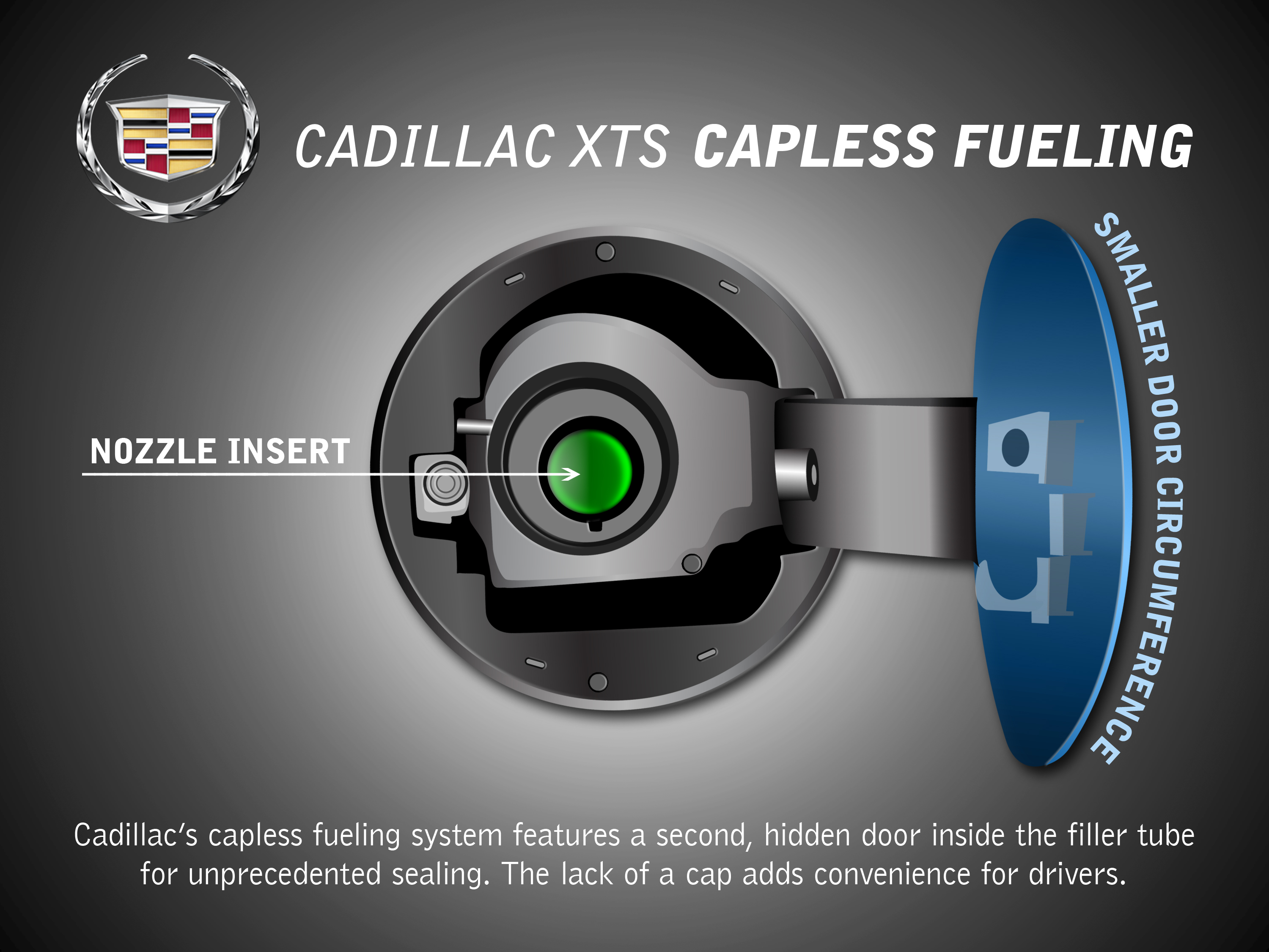 DETROIT – The new Cadillac XTS luxury sedan features many technologies that are noticed the instant the vehicle’s ignition button is pushed. But some advancements, like a new capless fuel filler assembly, hide literally behind closed doors.